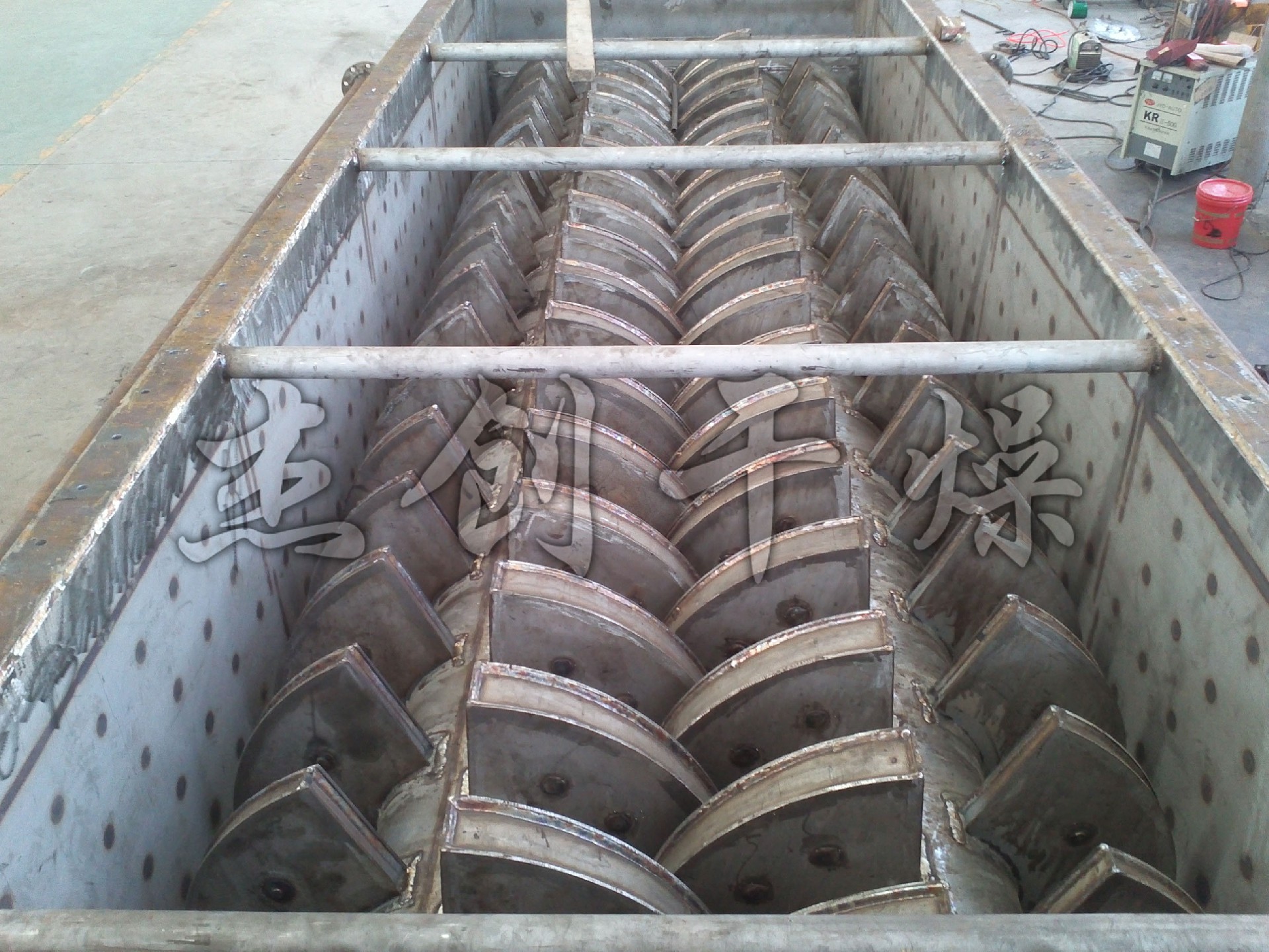空心軸上密集排列著楔型中空漿葉,熱介質(zhì)經(jīng)空心軸流經(jīng)漿葉。單位有效容積內(nèi)傳熱面積很大,熱介質(zhì)溫度從-40℃到320℃,可以是水蒸汽,也可以是液體型:如熱水、導(dǎo)熱油等。間接傳導(dǎo)加熱,沒(méi)有攜帶空氣帶走熱量,熱量均用來(lái)加熱物料。熱量損失僅為通過(guò)器體保溫層向環(huán)境的散熱。楔型漿葉傳熱面具有自清潔功能。物料顆粒與楔型面的相對(duì)運(yùn)動(dòng)產(chǎn)生洗刷作用,能夠洗刷掉楔型面上附著物料,使運(yùn)轉(zhuǎn)中一直保持著清潔的傳熱面。漿葉干燥機(jī)的殼體為Ω型,殼體內(nèi)一般安排二到四根空心攪拌軸。殼體有密封端蓋與上蓋,防止物料粉塵外泄而充fen發(fā)揮作用。