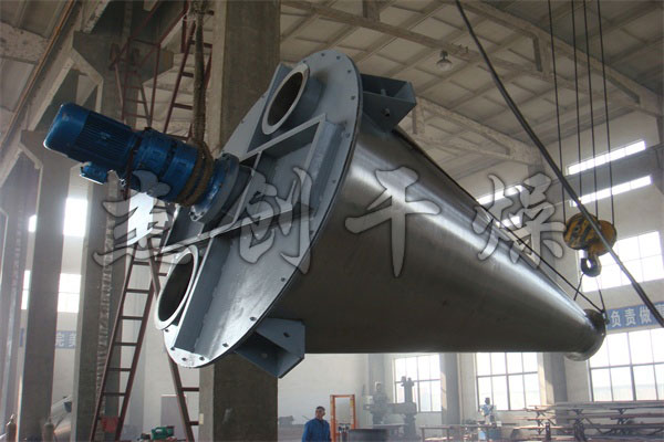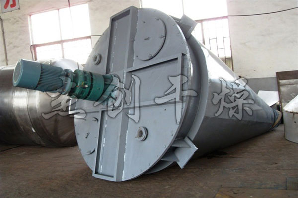 雙螺旋錐形混合機(jī)結(jié)構(gòu)主要由傳動(dòng)、螺旋、筒體、筒蓋、出料閥及噴液裝置等部件組成。