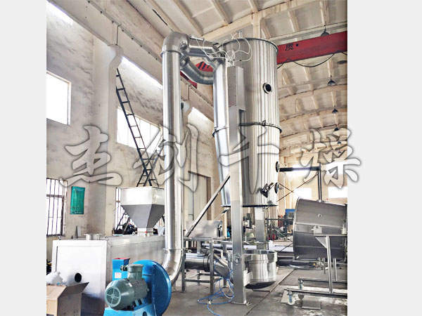 物料粉末粒子,在原料容器(流化床)中呈環(huán)形流化狀態(tài),受到經(jīng)過凈化后的加熱空氣預(yù)熱和混合,將粘合劑溶液霧化噴入,使若干粒子聚集成含有粘合劑的團(tuán)粒,由于熱空氣對(duì)物料的不斷干燥,使團(tuán)粒中水分蒸發(fā),粘合劑凝固,此過程不斷重復(fù)進(jìn)行,形成理想的、均勻的多微孔球狀顆粒。