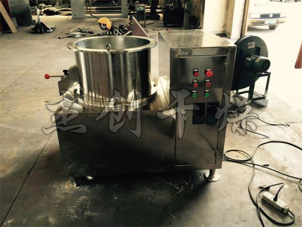 本機是通過設置旋轉離心盤、鼓風機、氣動噴槍,將濕顆粒制成美麗的球丸。將前道工序做成的濕顆粒投入旋轉離心盤內,啟動鼓風機后再將旋轉離心盤啟動,使?jié)耦w粒受到環(huán)隙空氣浮力、旋轉離心力、自身重力作用,呈環(huán)周繩股狀運動,從而形成真球度很高的球丸。