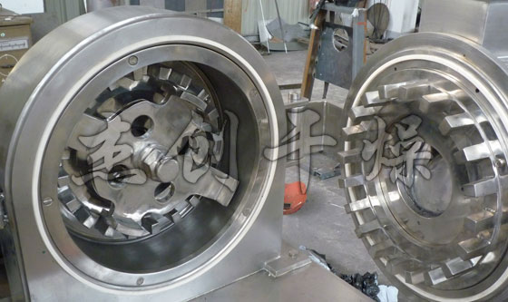 4、本機(jī)利用活動齒盤和固定齒盤問的高速相對運(yùn)動,使被粉碎物經(jīng)齒沖擊、摩擦及物料彼此間沖擊等綜合作用獲得粉碎。